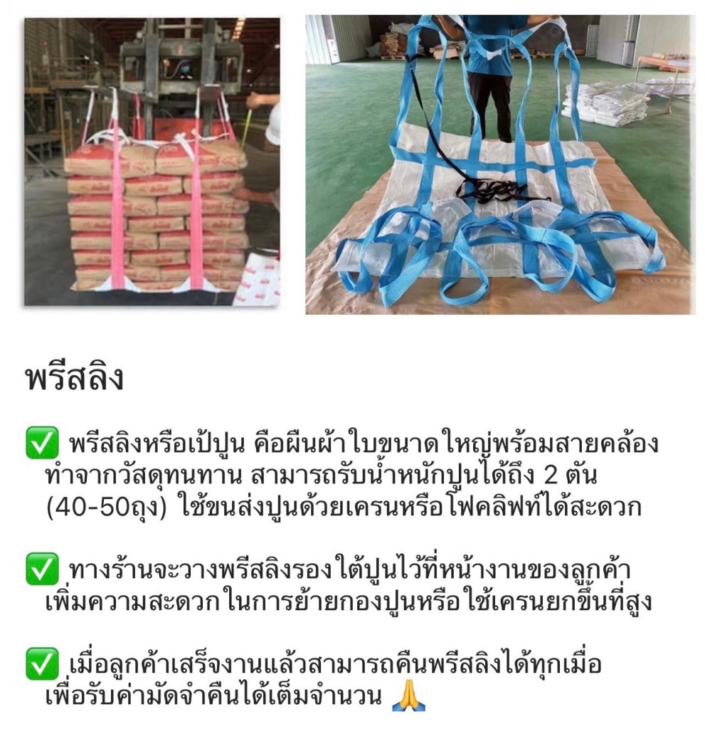 หากสั่งปูนซีเมนต์ถุง 40 กก. หรือ 50 กก. รวมกัน 2 ตันขึ้นไป ทางร้านจะจัดส่งโดยวางบนพรีสลิง หรือเป้ปูน เพื่อความสะดวกในการขนย้ายโดยรถเครน โดยลูกค้าจะต้องชำระค่ามัดจำพรีสลิงตามจำนวนที่ใช้งานจริง เช่น สั่งปูน 2 ตันจะต้องมัดจำพรีสลิง 1 เส้น สั่งปูน 6 ตันจะต้องมัดจำพรีสลิง 3 เส้น เป็นต้น หากลูกค้าใช้งานเสร็จแล้วสามารถนำพรีสลิงมาคืนที่ร้าน หรือโทรเรียกให้ทางร้านเข้าไปเก็บพรีสลิงคืนถึงหน้างาน เพื่อรับเงินมัดจำคืนได้เต็มจำนวน